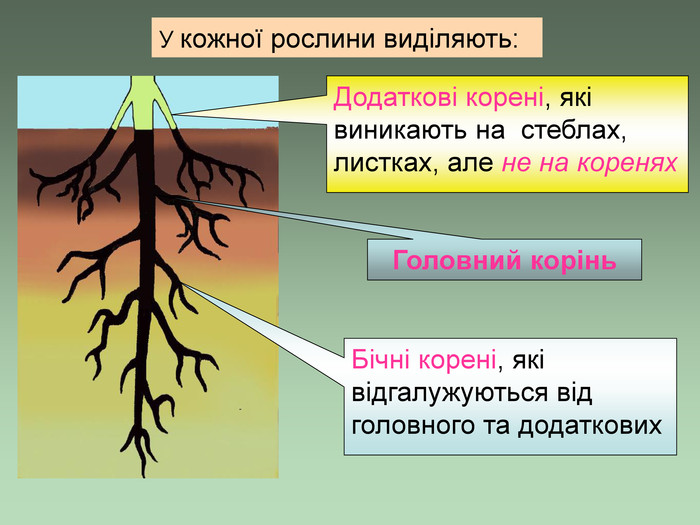 - Стержневою системою – коли головний корінь сильно виражений і є основною частиною кореневої системи, а бічні корені відходять від нього.
