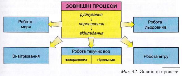 Земна кора піддається впливу різноманітних зовнішніх процесів, які характеризуються різним механізмом дії та результатами. До основних зовнішніх процесів належать: