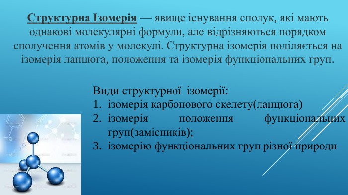 Ізомери — це сполуки, які мають різні структурні формули, але однакові молекулярні формули
