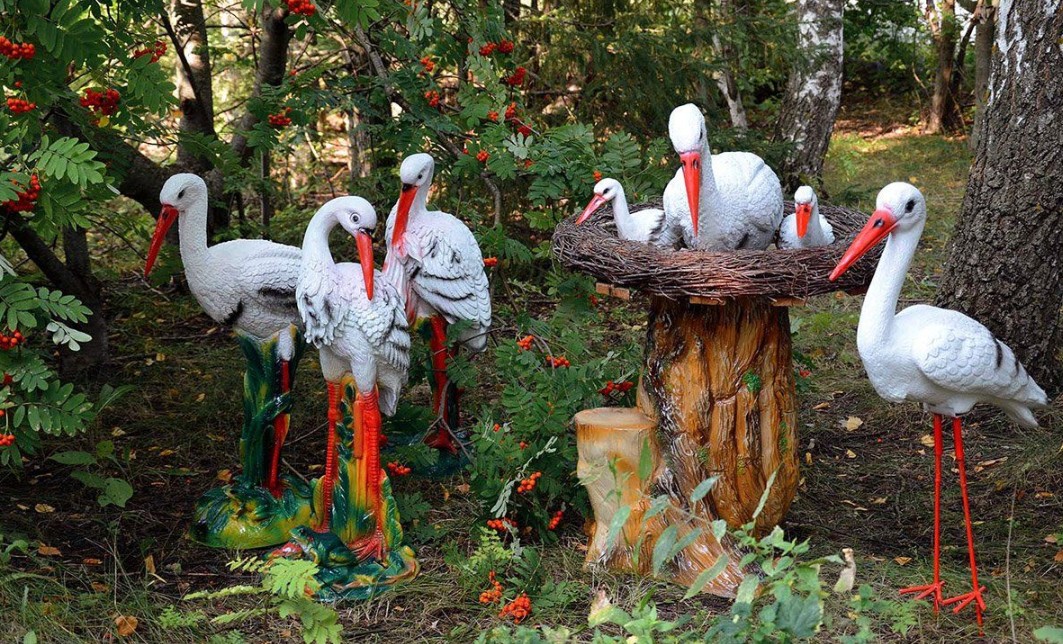 - Лелеки. Символ родини, вони завжди доречні на газонах чи біля водойм.