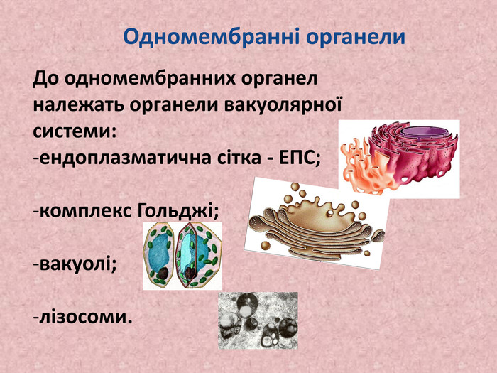 Одномембранні органели — це внутрішньоклітинні структури, які оточені лише однією фосфоліпідною мембраною. Така будова дозволяє їм виконувати спеціалізовані функції ізольовано від цитоплазми. Основними одномембранними органелами, до яких ми можемо дати відповідь на запитання «укажіть групу органел, які належать до одномембранних», є ендоплазматична сітка, апарат Гольджі, лізосоми, вакуолі, пероксисоми.