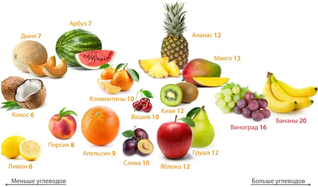 | Фрукт | Калорії (на 100 г) | Вміст цукрів (г) | Глікемічний індекс |