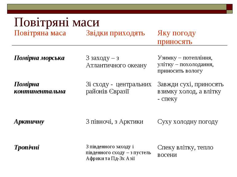 На території України домінують переважно три типи повітряних мас: атлантичні повітряні маси, арктичні повітряні маси та континентальні повітряні маси.