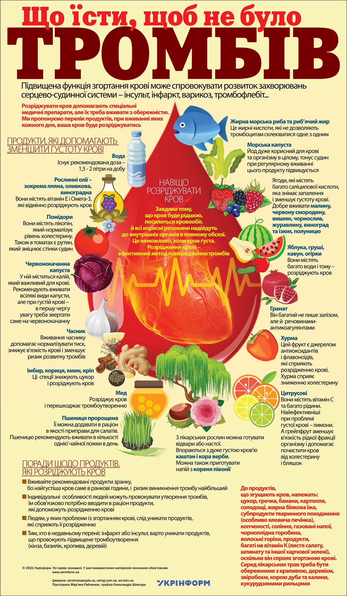 • Фрукти та ягоди: цитрусові (апельсини, лимони, грейпфрути), виноград, чорниця. Ці фрукти багаті на вітамін С та антиоксиданти, що знижують згортання крові.