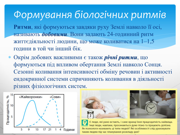 • Ендогенність: Ці ритми виникають внутрішньо, незалежно від зовнішнього середовища, але можуть бути синхронізовані з ним.
