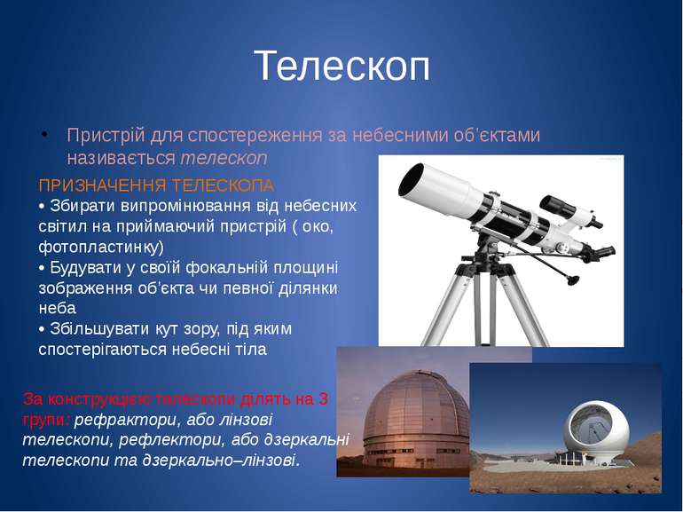 • Оптичні телескопи – найстаріший тип телескопів, які використовуються для візуальних спостережень та фотографічних знімків.