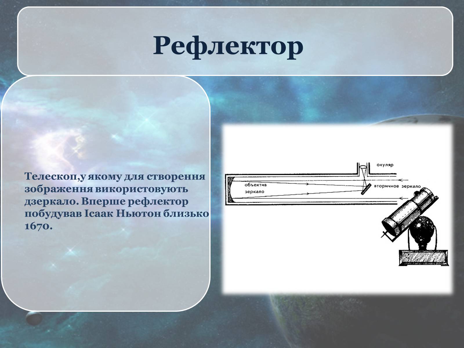 | Характеристика | Рефрактор (лінзовий телескоп) | Рефлектор (дзеркальний телескоп) |